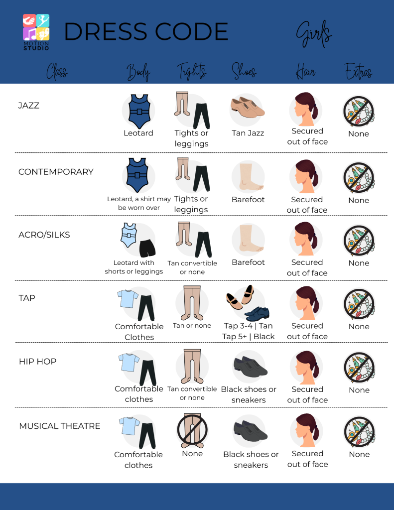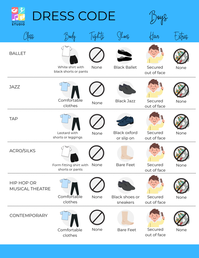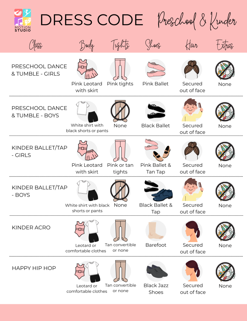 • Dancewear should be purchased at Motion Studio to ensure uniformity and quality.